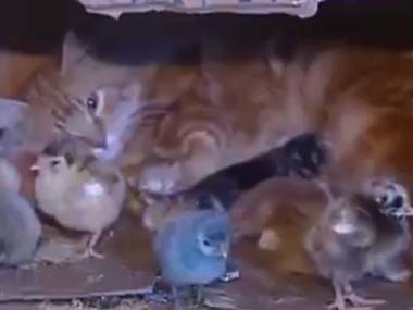 子猫と一緒にヒヨコを育てる母猫がいるんだってばよ
