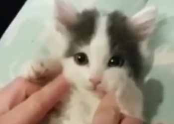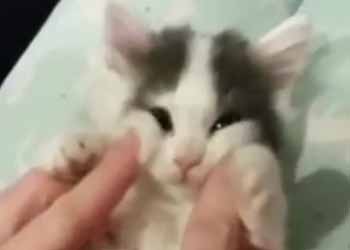 膝に乗せた子猫のほっぺたを、指で「ぷにぷに」押してみた。