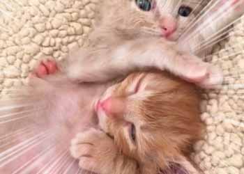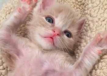 へそ天で、バンザイしている猫の赤ちゃん。