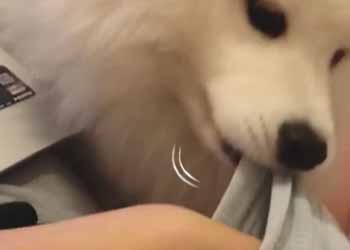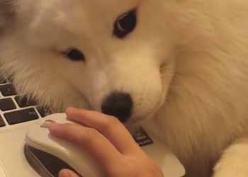 白いモフモフがノートパソコンに顔を乗せて、こっちをチラチラ。