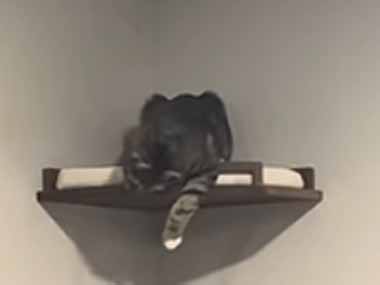 (椅子に乗って降ろすために捕まえようとしても、その瞬間から「飼い主の手から逃げるゲーム」が始まって奥に逃げてしまうため、こうするしかなかった。)