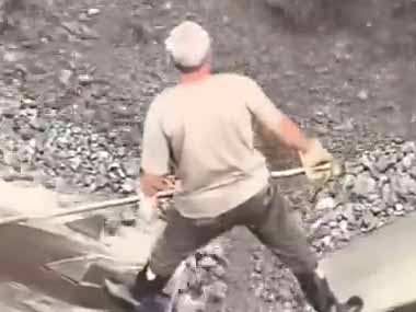 Workers keeping the gravel flowing in a narrow work channel