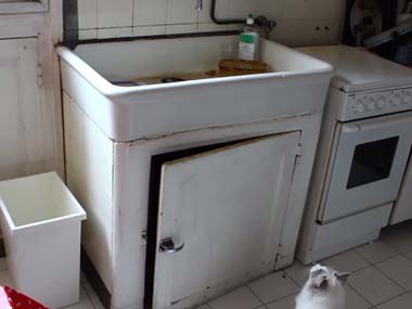 【ネコの記憶力】 猫のおもちゃがシンクの上に→「取りたいにゃ!」 → ゴミ箱を踏み台にして登ろうとする → 結果