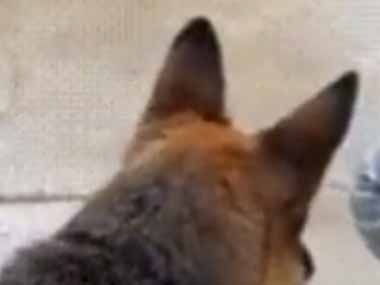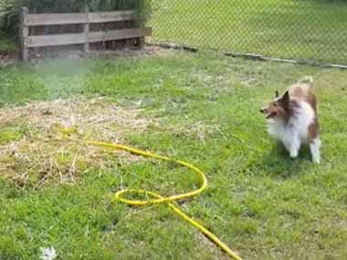スプリンクラーから出る水が、ちょっと怖いジャーマンシェパード。