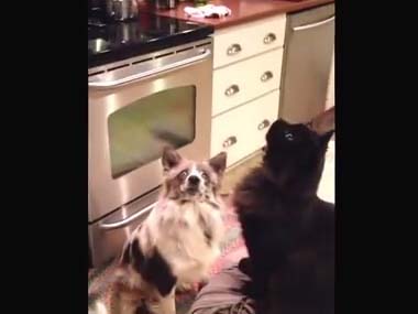 ネコの隣にポップコーンを置いてみた。床には犬がいる → 猫はこうした…