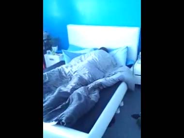 ベッドで「うにゃうにゃ」しているクロミツちゃん。